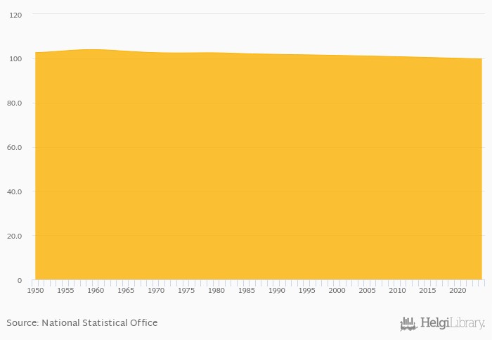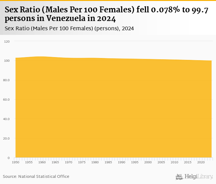 Sex ratio measured by males per 100 females fell 0.078% to 99.7 persons in Venezuela in 2024, according to the National Statistical Office.