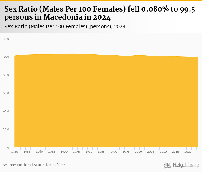 Sex ratio measured by males per 100 females fell 0.080% to 99.5 persons in Macedonia in 2024, according to the National Statistical Office.