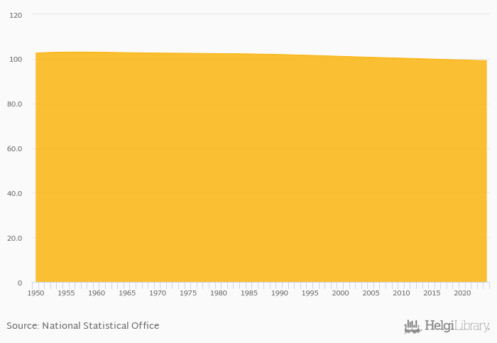 Historically, sex ratio measured by males per 100 females in Dominican Republic reached an all time high of 103 persons in 1957 and an all time low of 99.1 persons in 2024. When compared to Dominican Republic's main peers, sex ratio measured by males per 100 females in Cuba amounted to 101 persons, 96.8 persons in Jamaica, 94.2 persons in Mexico and 97.0 persons in USA in 2024.