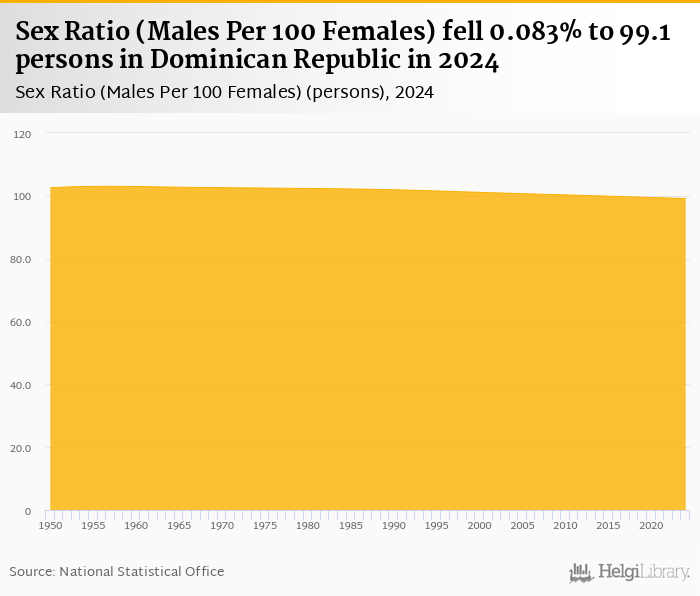 Sex ratio measured by males per 100 females fell 0.083% to 99.1 persons in Dominican Republic in 2024, according to the National Statistical Office.