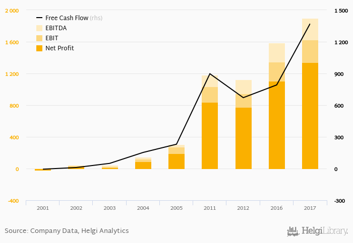 The company generated cash, defined by a sum of net profit and depreciation, of CZK 1,608 mil or 39.1% of sales. When investments are excluded, free cash flow reached CZK 1,371 mil, or 33.3% of sales in 2017.