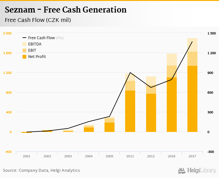 Seznam made a net profit of CZK 1,338 mil with revenues of CZK 4,117 mil in 2017, up by 20.9% and up by 11.1%, respectively, compared to the previous year. This translates into a net margin of 32.5%.