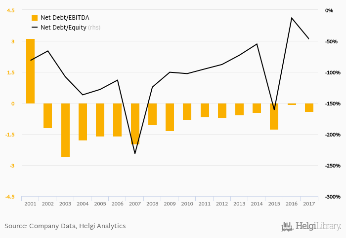 Historically, the firm’s net debt to equity reached a high of -13.2% in 2016 and a low of -232% in 2007 between 2001 and 2017. The average for the last five years was -69.9%.