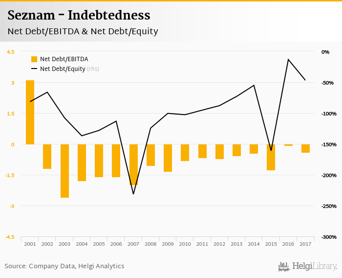 Seznam's net debt stood at CZK -750 mil and accounted for -47.1% of equity at the end of 2017. The ratio is down 33.9 pp compared to the previous year.