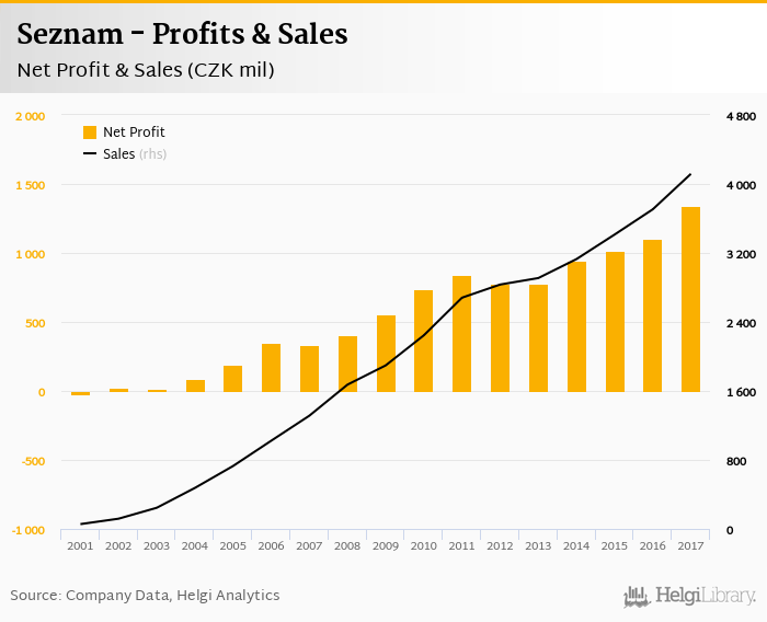 Seznam made a net profit of CZK 1,338 mil in 2017, up 20.9% compared to the previous year. Total sales reached CZK 4,117 mil, which is up 11.1% when compared to the previous year.