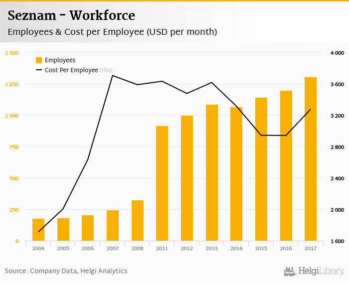 Seznam employed 1,304 employees in 2017, up 8.94% compared to the previous year. Historically, between 2004 and 2017, the firm's workforce hit a high of 1,304 employees in 2017 and a low of 177 employees in 2004.