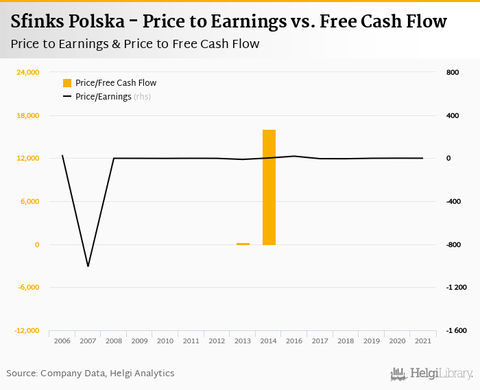 Regarding cash generated defined by the sum of net profit and depreciation, the stock traded at -4.16x at the end of 2021. When investments are excluded to get free cash flow, Sfinks Polska traded at 2.21x.