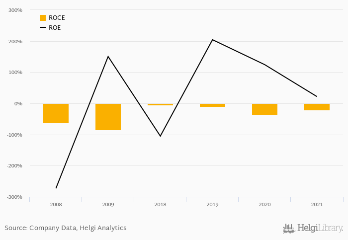 The result implies a return on equity of 21.8% and a return on invested capital of -20.2% in 2021. That is compared to an average of 27.3% and -17.5% over the last five years.