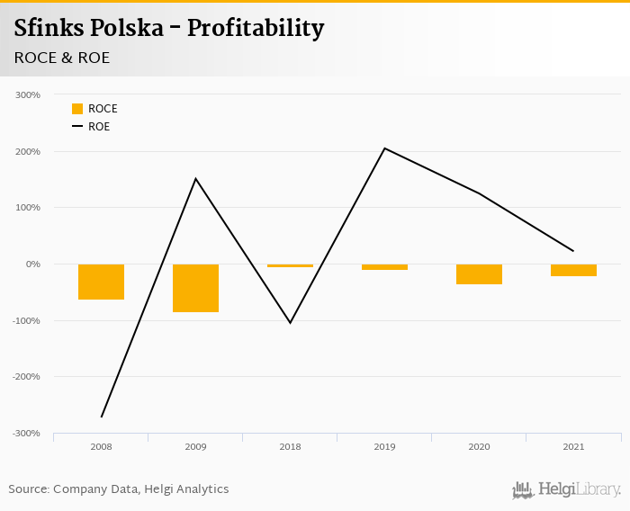 Sfinks Polska made a net profit of PLN -19.6 mil in 2021, up 68% compared to the previous year. Historically, between 2005 and 2021, the company's net profit reached a high of PLN 34.6 mil in 2014 and a low of PLN -70.5 mil in 2008.