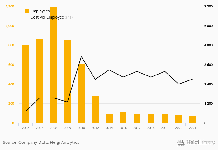 Staff cost represented 15.7% of sales in 2021, 7.18 pp lower than a decade ago.