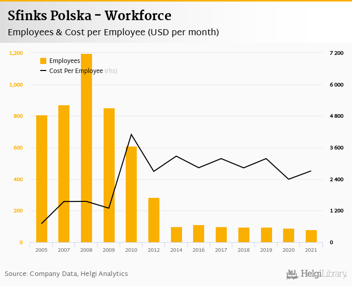 Sfinks Polska employed 79.0 employees in 2021, down 12.2% compared to the previous year. Historically, between 2005 and 2021, the firm's workforce hit a high of 1,196 employees in 2008 and a low of 79.0 employees in 2021.