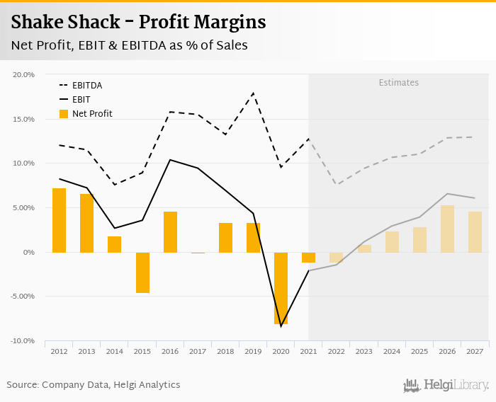 Shake Shack made a net profit of USD -8.66 mil with revenues of USD 740 mil in 2021, up by 79.5% and up by 41.5%, respectively, compared to the previous year.