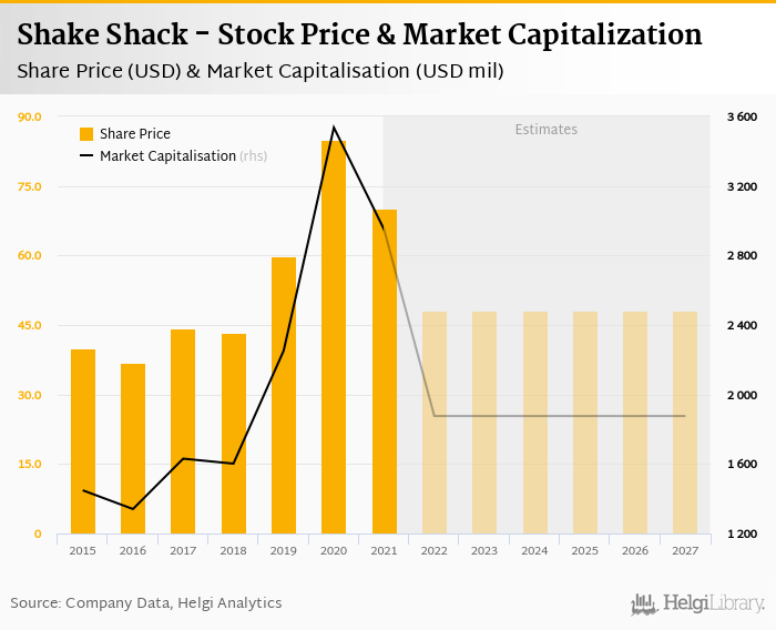 Shake Shack stock traded at USD 70.1 per share at the end 2021 implying a market capitalization of USD 2,949 mil.