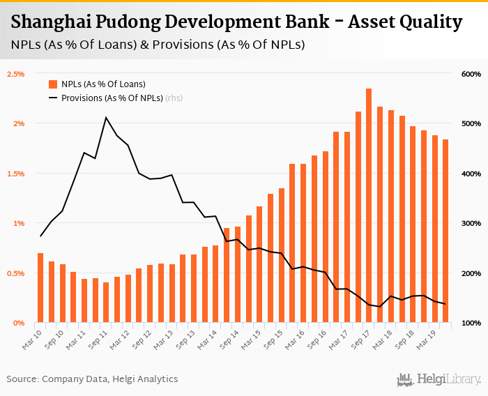 Shanghai Pudong Development Bank's non-performing loans reached 1.84% of total loans at the end of 2019-06-30, down from 2.08% compared to the previous year. Historically, the NPL ratio hit an all time high of 2.35% in 2017-09-30 and an all time low of 0.403% in 2011-09-30.