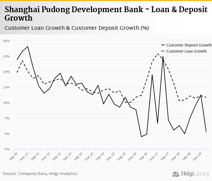 Shanghai Pudong Development Bank's customer loan growth reached 11.6% in 2019-06-30, up from 10.8% compared to the previous year. Historically, the bank’s loans growth reached an all time high of 25.7% in 2017-03-31 and an all time low of 9.97% in 2015-12-31. In the last decade, the average annual loan growth amounted to 0%.
