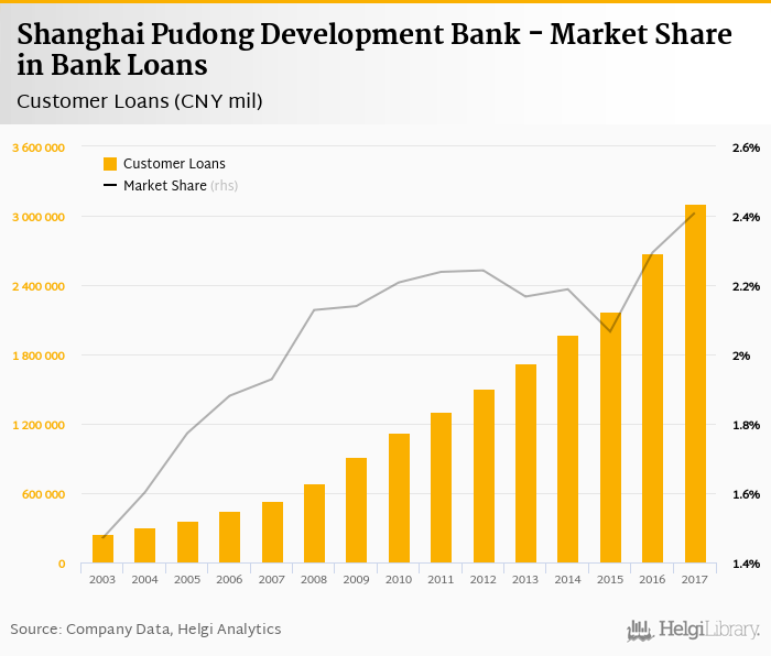 Shanghai Pudong Development Bank accounted for 2.41% of all customer loans issued in China at the end of 2017. Historically, the bank’s market share in customer loans reached an all time high of 2.41% in 2017 and an all time low of 1.47% in 2003.