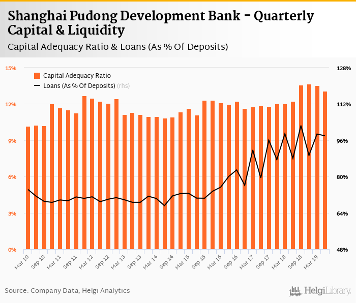 Shanghai Pudong Development Bank's capital adequacy ratio reached 13.1% at the end of second quarter of 2019, down from 13.5% when compared to the previous quarter. Historically, the bank’s capital ratio hit an all time high of 13.7% in 4Q2018 and an all time low of 10.2% in 1Q2010.