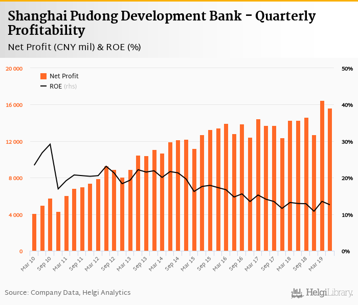 Shanghai Pudong Development Bank made a net profit of CNY 15,647 mil in the second quarter of 2019, up 9.7% when compared to the same period of last year. This implies a return on equity of 12.6%.