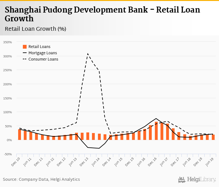 Shanghai Pudong Development Bank's retail loans reached CNY 1,601,760 mil at the end of 2019-06-30, up 3.84% compared to the previous year. In the last decade, the average annual loan growth amounted to 0%.