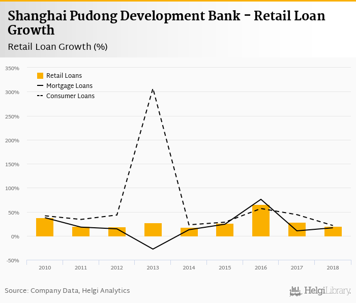 Shanghai Pudong Development Bank's retail loans reached CNY 1,483,230 mil at the end of 2018, up 19.4% compared to the previous year. In the last decade, the average annual loan growth amounted to 0%.