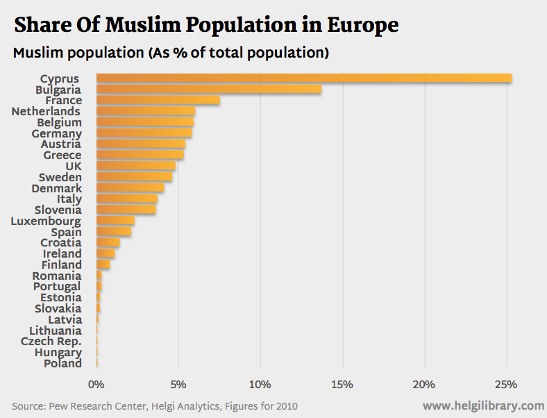 The Muslim share of Europe’s total population has been increasing steadily. The top countries of origin of Muslims in Western Europe are Pakistan, Turkey and the Maghreb countries (Morocco, Algeria, Tunisia).