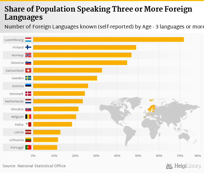 Based on a comparison of 27 countries in 2011, Luxembourg ranked the highest in Number of Foreign Languages known (self-reported) by Age - 3 languages or more with 72.0% followed by Finland and Norway. On the other end of the scale was Ireland with 1.30%, Hungary with 1.70% and Bulgaria with 2.80%.