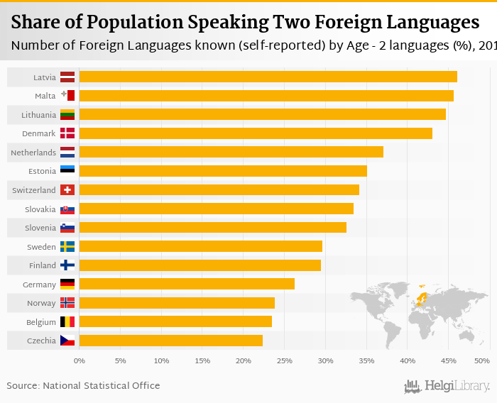 Based on a comparison of 28 countries in 2011, Latvia ranked the highest in Number of Foreign Languages known (self-reported) by Age - 2 languages with 46.1% followed by Malta and Lithuania. On the other end of the scale was Turkey with 2.30%, Ireland with 5.20% and Hungary with 9.20%.