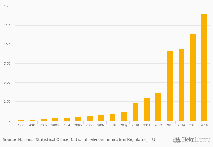 Historically, share of population using internet in Burkina Faso reached an all time high of 14.0% in 2016 and an all time low of 0.077% in 2000. When compared to Burkina Faso's main peers, share of population using internet in Ghana amounted to 34.7%, 41.2% in Ivory Coast, 11.1% in Mali and 4.32% in Niger in 2016.
