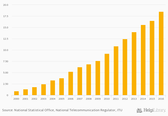 Historically, share of population using internet in Gambia reached an all time high of 18.5% in 2016 and an all time low of 0.922% in 2000. When compared to Gambia's main peers, share of population using internet in Guinea Bissau amounted to 3.76%, 11.1% in Mali, 18.0% in Mauritania and 25.7% in Senegal in 2016.