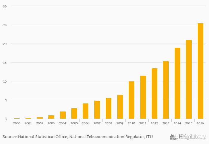 Share of population using internet rose 21.5% to 25.5% in Zambia in 2016, according to World Bank.