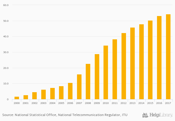 Historically, share of population using internet in China reached an all time high of 54.3% in 2017 and an all time low of 1.78% in 2000.