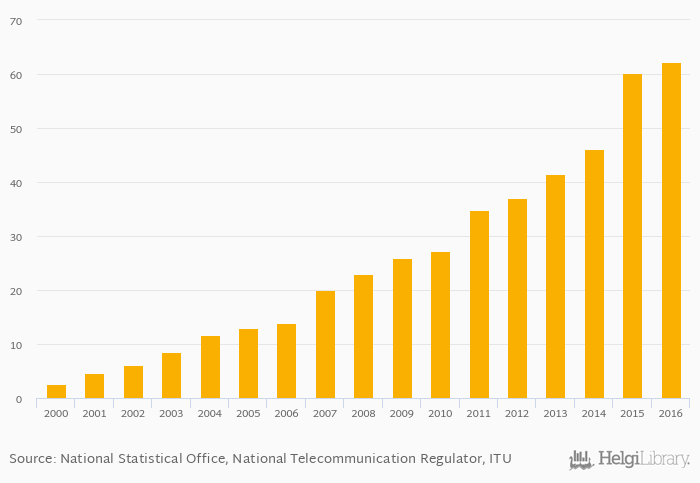 Historically, share of population using internet in Jordan reached an all time high of 62.3% in 2016 and an all time low of 2.62% in 2000. When compared to Jordan's main peers, share of population using internet in Iraq amounted to 21.2%, 79.7% in Israel, 74.9% in Saudi Arabia and 31.9% in Syria in 2016.