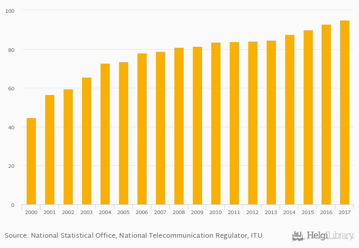 Historically, share of population using internet in South Korea reached an all time high of 95.1% in 2017 and an all time low of 44.7% in 2000.