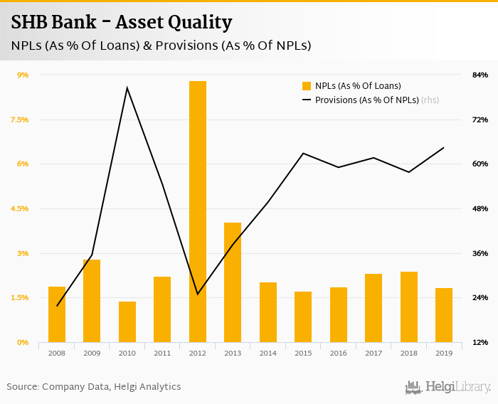 SHB Bank's non-performing loans reached 1.83% of total loans at the end of 2019, down from 2.40% compared to the previous year. Historically, the NPL ratio hit an all time high of 8.81% in 2012 and an all time low of 1.39% in 2010.