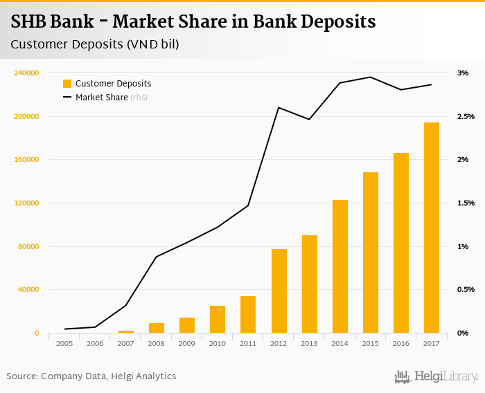 SHB Bank accounted for 2.86% of all customer deposits taken by banks in Vietnam at the end of 2017. Historically, the bank’s market share in customer deposits reached an all time high of 2.95% in 2015 and an all time low of 0.043% in 2005.