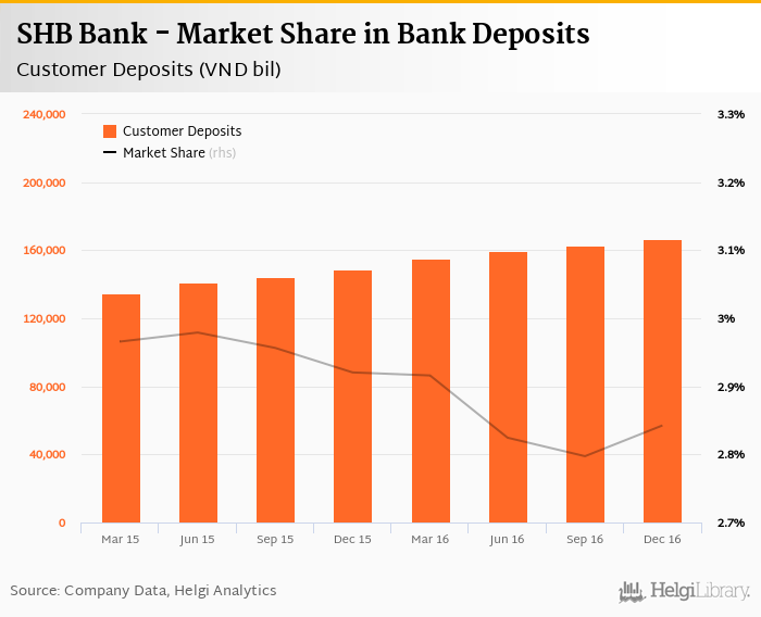 SHB Bank's customer deposits reached VND 166,576 bil in 2016-12-31, up 2.14% compared to the previous year.