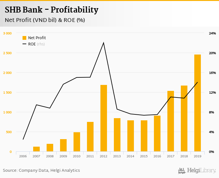 SHB Bank made a net profit of VND 2,458 bil in 2019, up 47.0% compared to the previous year. This implies a return on equity of 14.0%.