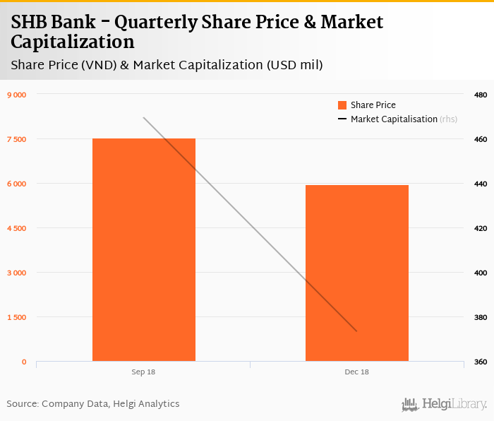 SHB Bank stock traded at VND 5,955 per share at the end of fourth quarter of 2018 implying a market capitalization of USD 373 mil.