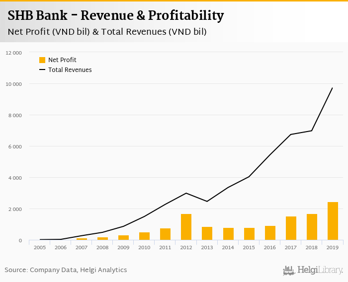SHB Bank made a net profit of VND 2,458 bil under revenues of VND 9,731 bil in 2019, up 47.0% and 39.6% respectively compared to the previous year.
