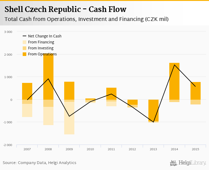 At the end of 2015, the company had a net debt of CZK 217 mil, or 0.337x of EBITDA and 0.092 of equity. Net working capital amounted to CZK -270 mil, or -1.57% of sales. The cash conversion cycle stood at -7.07 days in 2015. This is a deterioration compared to the previous year (12.1 days), so Shell Czech Republic’s working capital was tied up for 19.1 more days.