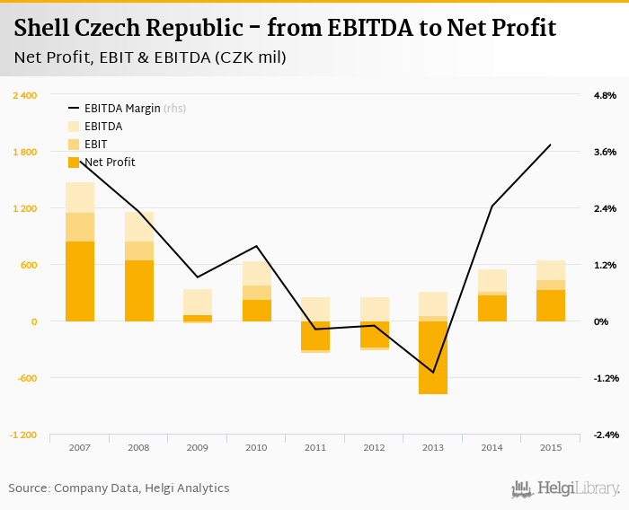 Shell Czech Republic made a net profit of CZK 338 mil with revenues of CZK 17,231 mil in 2015, up by 22% and down by 24.8%, respectively, compared to the previous year. This translates into a net margin of 1.96%.