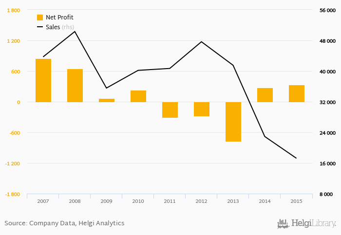 Sales have fallen by 15.6% a year on average since 2010. They reached a high of CZK 50,304 mil in 2008 and a low of CZK 17,231 mil in 2015.