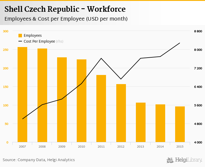 Shell Czech Republic employed 97.0 employees in 2015, down 4.9% compared to the previous year. Historically, between 2007 and 2015, the firm's workforce hit a high of 257 employees in 2007 and a low of 97.0 employees in 2015.