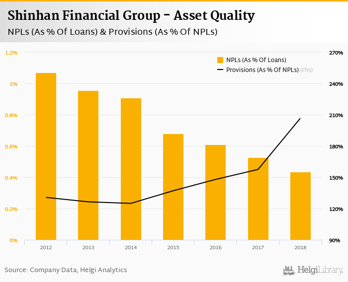 Shinhan Financial Group's non-performing loans reached 0.436% of total loans at the end of 2018, down from 0.528% compared to the previous year. Historically, the NPL ratio hit an all time high of 1.07% in 2012 and an all time low of 0.436% in 2018.