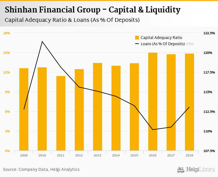 Shinhan Financial Group's capital adequacy ratio reached 14.9% at the end of 2018, up from 14.8% compared to the previous year. Historically, the bank’s capital ratio hit an all time high of 15.0% in 2016 and an all time low of 11.4% in 2011.