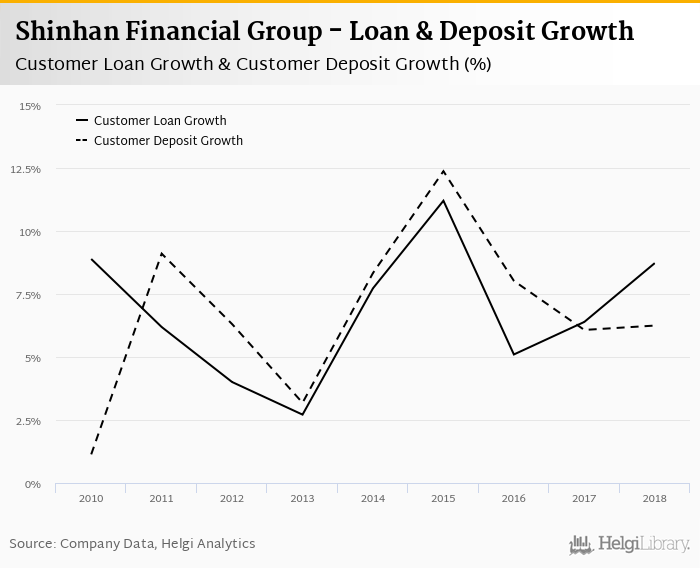 Shinhan Financial Group's customer loan growth reached 8.73% in 2018, up from 6.39% compared to the previous year. Historically, the bank’s loans growth reached an all time high of 11.2% in 2015 and an all time low of 2.71% in 2013. In the last decade, the average annual loan growth amounted to 0%.
