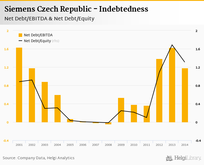 Siemens Czech Republic's net debt stood at CZK 4,281 mil and accounted for 1.31 of equity at the end of 2014. The ratio is down 0.379 pp compared to the previous year.