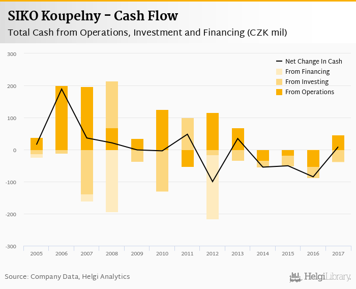 SIKO Koupelny's operating cash flow stood at CZK 46.6 mil in 2017, up 189% when compared to the previous year. Historically, between 2005 - 2017, the firm’s operating cash flow reached a high of CZK 200 mil in 2006 and a low of CZK -52.3 mil in 2016.
