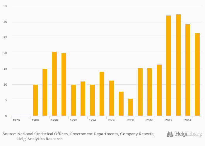 Historically, silver (mine) production in Thailand reached an all time high of 32.4 kt in 2013 and an all time low of 0.001 kt in 1971.