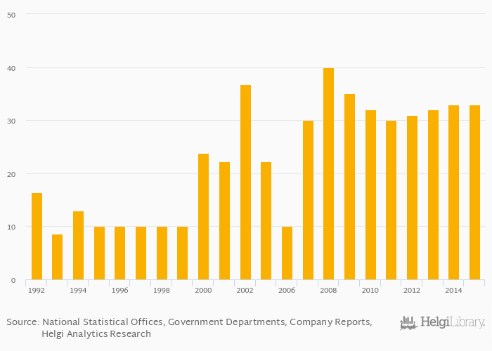Silver (mine) production rose 0% to 33.0 kt in Macedonia in 2015, according to the National Statistical Office.